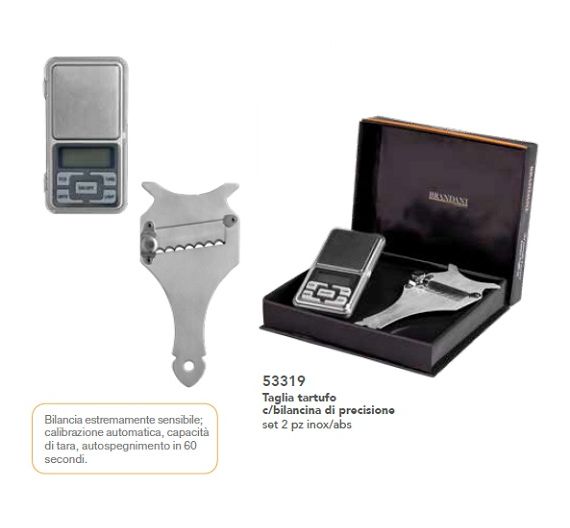 Brandani's Gourmet set consisting of a stainless steel truffle cutter with wavy blade and a precision scale with automatic calibration, tare capacity, self-shutdown.
