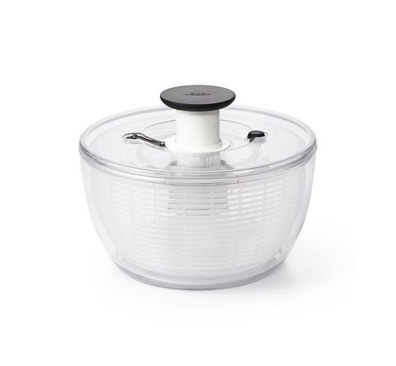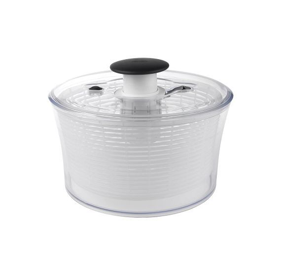 OXO Good Grips Salad Spinner: Dry salad greens with a simple press of the soft, non-slip knob. The non-slip base keeps the bowl steady on the countertop and the built-in brake button stops the Salad Spinner for unloading. The basket doubles as a colander, and the lid comes apart for easy cleaning.