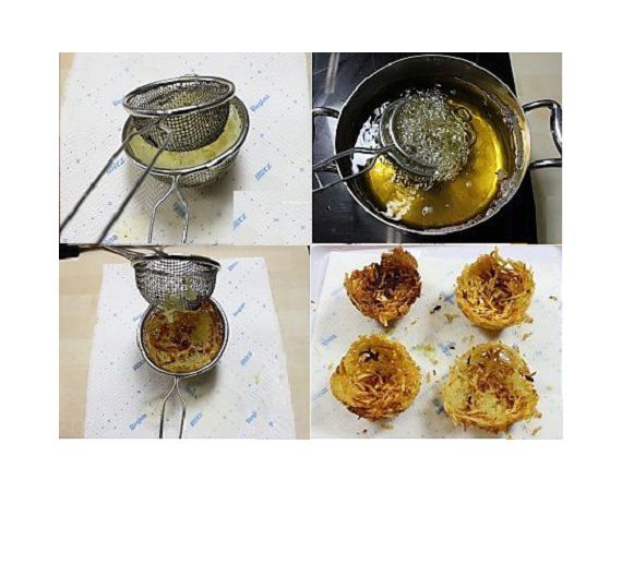 Simple accessory, with double mesh ideal for making vegetable nests (potatoes, courgettes) fried. Insert the food inside the two net strainers, a comfortable handle, long and resistant, will allow you to fry and make a vegetable container of your dishes in just a few minutes. All in stainless steel.