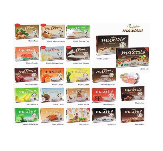 Abbiamo una vastissima scelta di confetti con mandorla aromatizzati ai gusti frutta, crema, ...sono i Maxtris. Realizzati con una mandorla tostata avvolta da uno strato di cioccolato bianco aromatizzato al gusto indicato nella confezione, ricoperto da un sottile strato di zucchero.