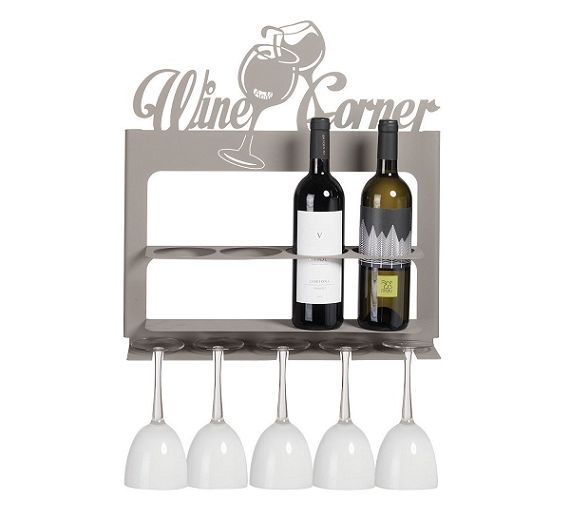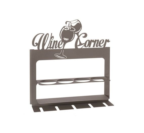 Bottle holder with four places reserved for them. Decorated with modern and elegant writing "Wine Corner" and two glasses of wine. With four recesses for a convenient cup holder. Available in mud color