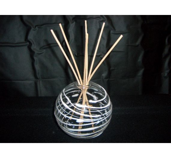 Classic sphere d. 9.8 cm with hole to put the sticks and spread the perfume (not included) in the package. It is made of borosilicate glass with melted colored glass with spiral decoration inside. Used as a favor, it comes complete with box. Handmade in Italy: over 20 pieces, offer prices are made (contact us).