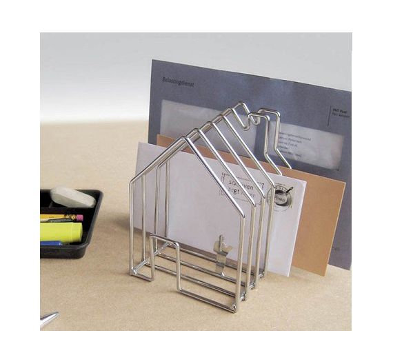 Elegant magazine rack in the shape of a house: in its center is the famous man who reads. Made of steel wire, it measures 22.5 cm in length and 28 cm in height