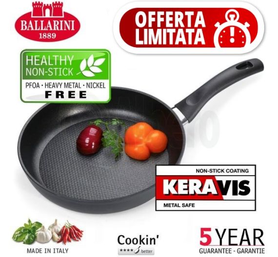 Fonti di calore: gas, piastra elettrica, piastra vetroceramica, electricity (radiant ring).Keravis: Rivestimento antiaderente rinforzato con elevata resistenza all’usura. Rivestimento composto da tre strati antiaderenti rinforzati con particelle ceramiche ad elevata durezza.