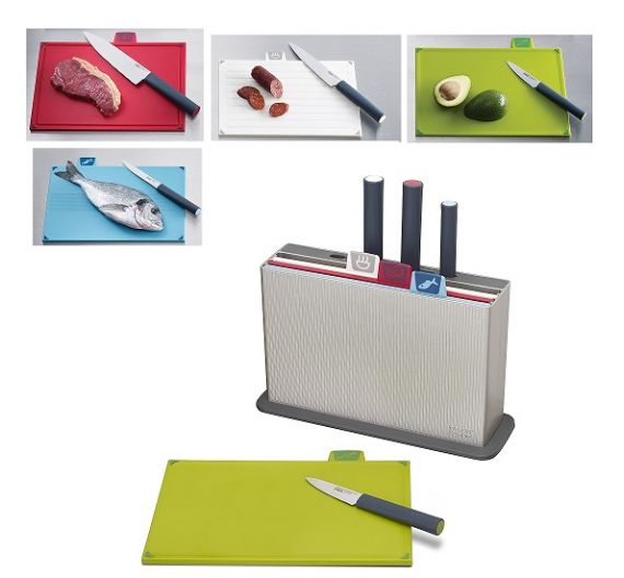 A practical and hygienic set of four cutting boards and knives. Each cutting board is distinguished by color and pictogram, and is suitable for cutting a specific type of food with the dedicated knife provided in a special housing, ensuring less passage of bacteria from one food to another.