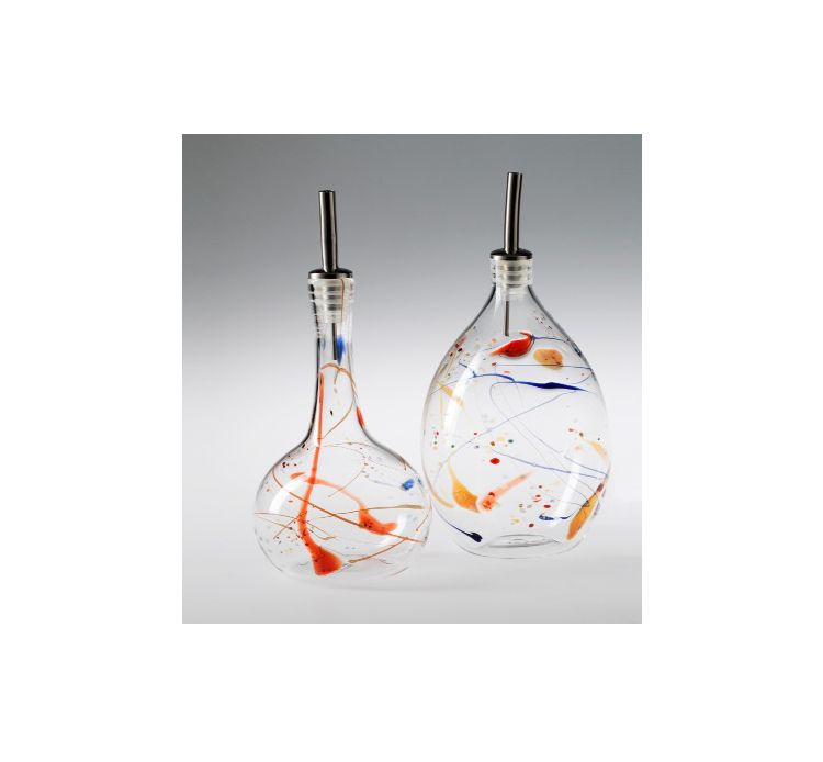 Maggiori dettagliThey are unique and each time with different colors. Pair of ampoules for oil and vinegar in transparent borosilicate glass with colored glass inserts, produced with the traditional technique of light blown, with non-drip spout in stainless steel and silicone
