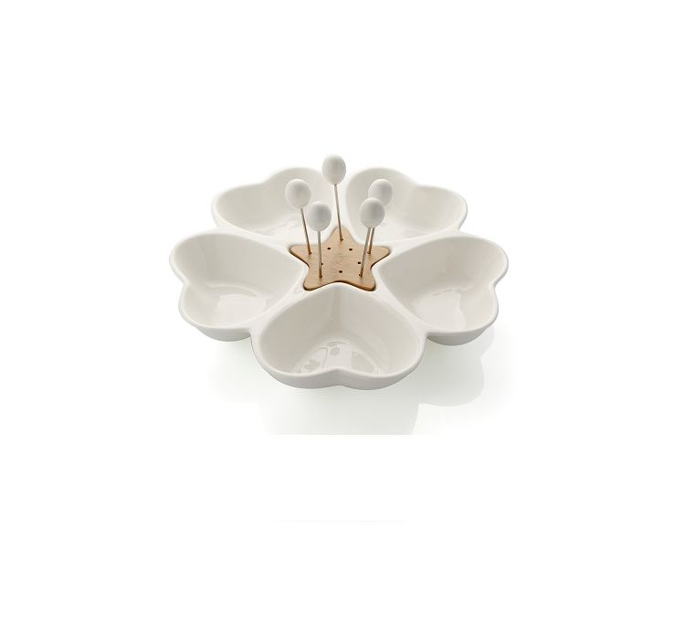 Quality and elegance in the form of an appetizer tray. The white Love appetizer tray, made of porcelain and bamboo, is poised to assert its leading role among the appetizer trays offered by BRANDANI Gift Group. The centerpiece is divided into two compartments and a space ready to accommodate two stainless steel forks with ceramic knobs. Size: 23x22.5 cm
