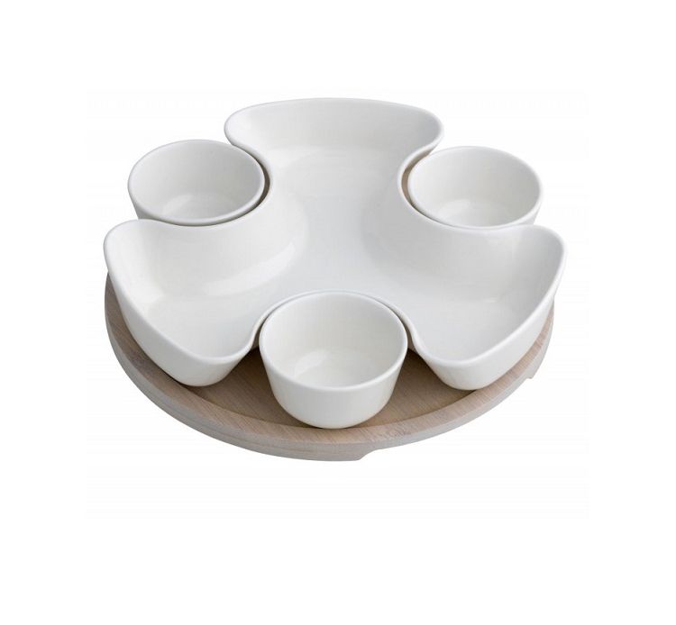 Quality and elegance in the form of an appetizer tray. The white Love appetizer tray, made of porcelain and bamboo, is poised to assert its leading role among the appetizer trays offered by BRANDANI Gift Group. The centerpiece is divided into two compartments and a space ready to accommodate two stainless steel forks with ceramic knobs. Size: 23x22.5 cm