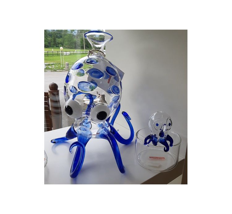 Pitcher in borosilicate glass internally decorated with a in colored glass Octopus. Each figure is handcrafted in blown glass making every single pitcher a unique piece. Capacity: 1.5l