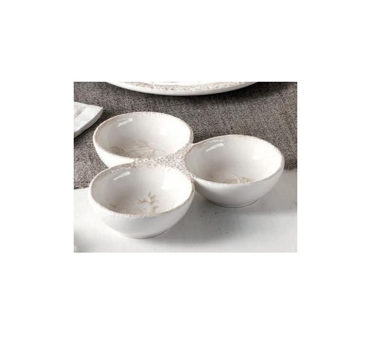 Maggiori dettagliChristmas collection year 2013 of L’oca Nera: Elegant saucer made from the union of three bowls with relief of berries and a reindeer.