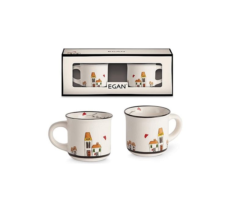 The houses are the prevailing decoration on a white enamel and their nostalgic and stylized shape makes them current and suitable for all tables