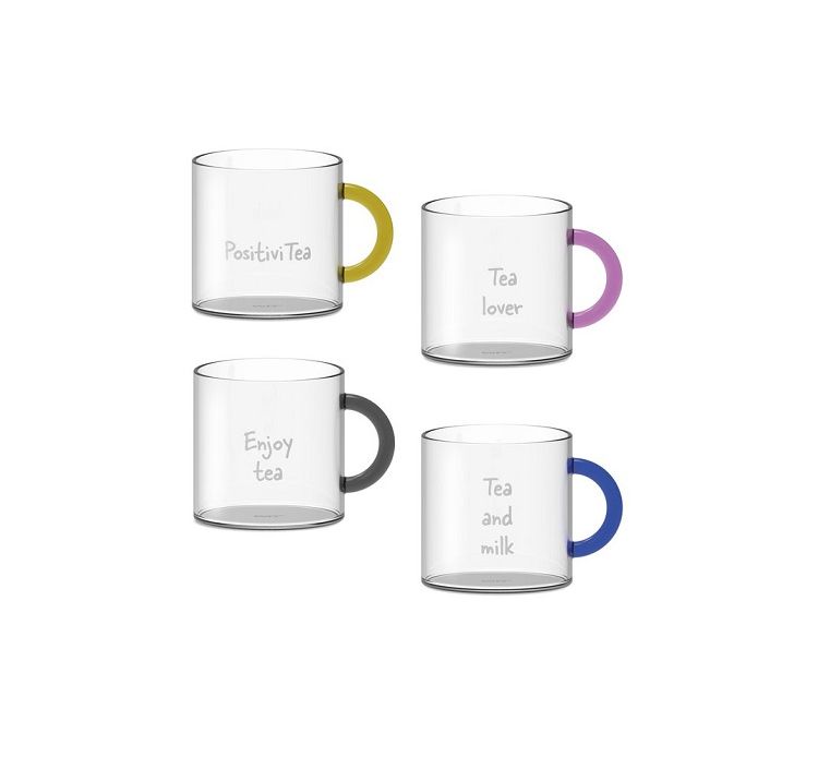 Maggiori dettagliSet of 4 teacups in borosilicate glass with colored handle and decorative writing. The modern shape of these cups makes them unique and original. Capacity: 250ml.