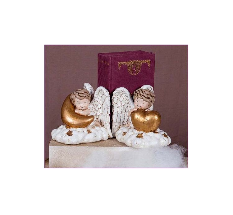 Maggiori dettagliSet realizzato da due reggilibri, rispettivamente un angelo con cuore e uno con luna. L' oggetto misura: cm 11x11h ed è realizzato in resina colorata.