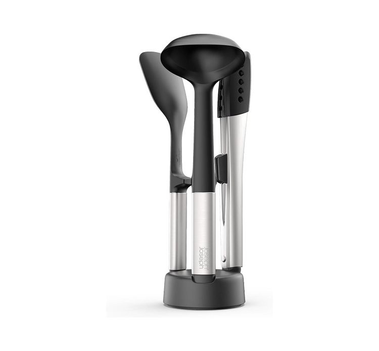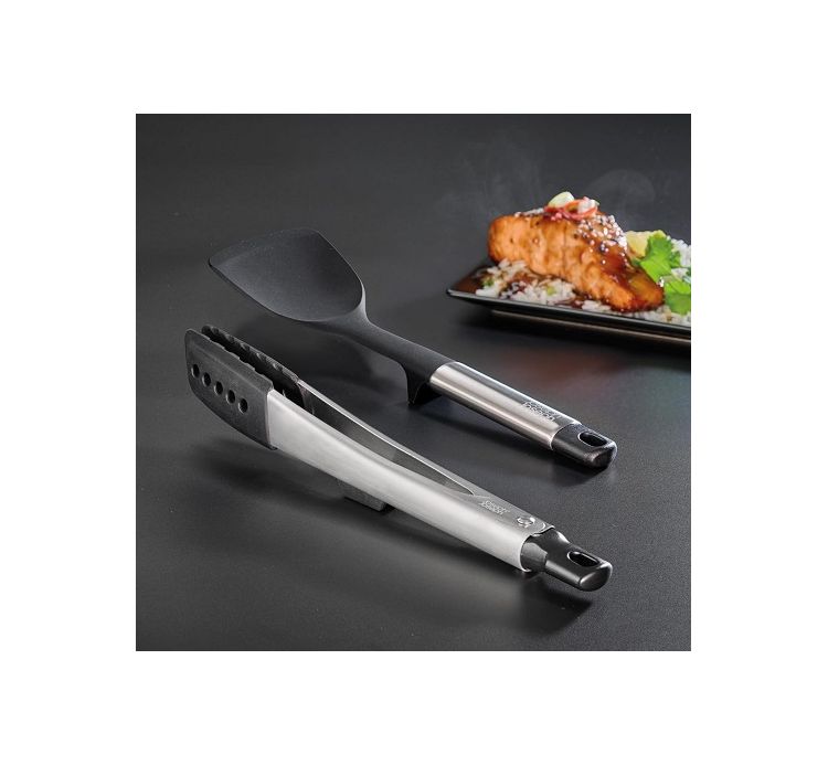 Maggiori dettagliThe Joseph Joseph Elevate Fusion set is designed to optimize kitchen space with a sleek and functional design. Crafted from BPA-free plastic, stainless steel, and silicone in black and silver, it measures 15 x 15 x 31.5 cm. The utensils are heat-resistant up to 210°C and feature weighted handles that prevent the heads from touching surfaces, ensuring greater hygiene.