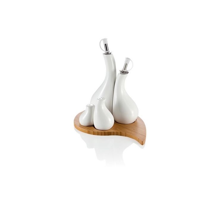 Maggiori dettagliFour porcelain elements and a bamboo support. Elements conjugated under the effigy of elegance, refinement and practicality, ready to conquer your table. The white drop menage will be the real protagonist among your courses, because its harmonious shapes and practicality in use will make it a product that you will no longer be able to do without. Size: cm 24x16x24.5h Code 55452