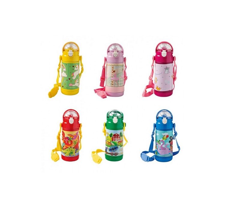 Maggiori dettagli0.35 l baby thermal bottle with colored pattern ideal for children made of abs and stainless steel, it guarantees maximum practicality thanks to its straw, which makes it even more comfortable to use. It is equipped with a shoulder strap, equipped with a safety lock to prevent accidental opening of the cap and an airtight seal, to prevent liquids from leaking.
