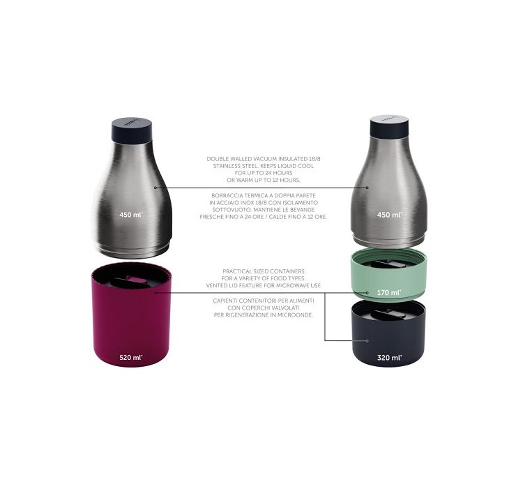Maggiori dettagliIn each situation you have a container for liquids and two for food together. Innovative insulated thermos and lunch box in a single solution: a large 450 ml stainless steel bottle for cold drinks for up to 24 hours and hot drinks for up to 12. A practical 170 and 320 ml lunch box, suitable for microwaves and dishwasher safe. Airtight lunch box with valve lids