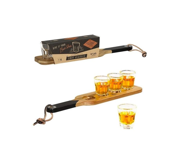 Maggiori dettagliGive it your best shot with the Gentlemen's Hardware Shot Paddle & Glasses, an acacia wood serving plank with a painted black handle, a real leather tie for hanging and space for the four shot glasses. Cheers, Salute, Gambie, Prost!