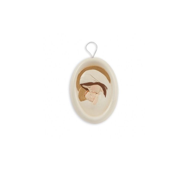 Oval shaped tile with vertical orientation to hang with loop buttonhole, ideal for wedding favors or baptism gifts, wedding, first communion. Neutral colors with addition of gold leaf details.