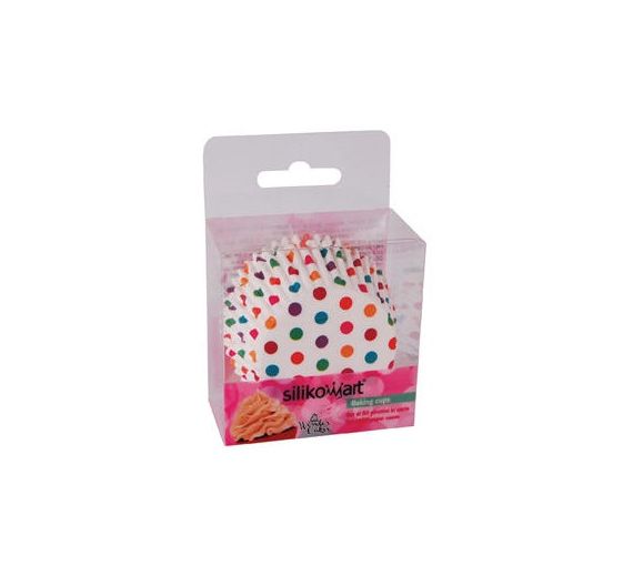 Set 50 pirottini in carta decorati dal diametro di 5 cm ideali per cuocere in forno e servire cupcakes, muffin e dolcetti. Decoro punti colorati