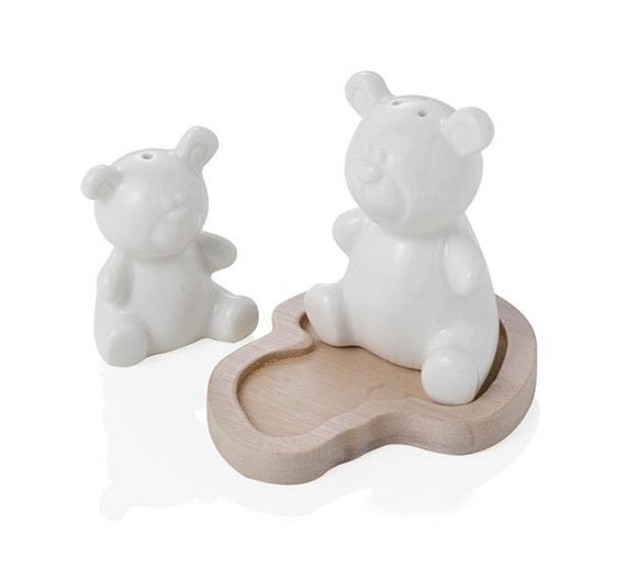 Due elementi in porcellana a forma di orsettoed un supporto in bamboo. Elementi coniugati sotto l’effige di eleganza, raffinatezza e praticità, pronti a conquistare la tua tavola. Ideale per bomboniere