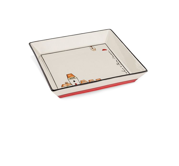 Le casette sono il decoro prevalente su uno smalto bianco e la loro forma nostalgica e stilizzata le rende attuali e adatte a tute le tavole