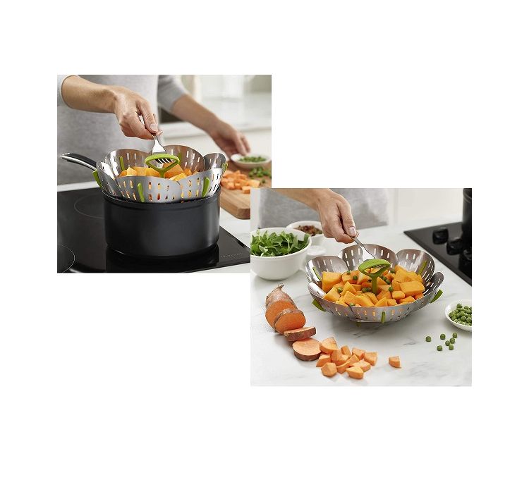 Maggiori dettagliNuovo cestello per cuocere a vapore le verdure. Realizzato in inox e polipropilene di alta qualità, il cestello ha lati autoregolanti per essere contenuto in diverse pentole, piedini in silicone resistenti al calore ed un' innovativa protezione per le dita in silicone, per proteggerle dalle scottature durante il sollevamento. Colore verde, codice 45033 Joseph