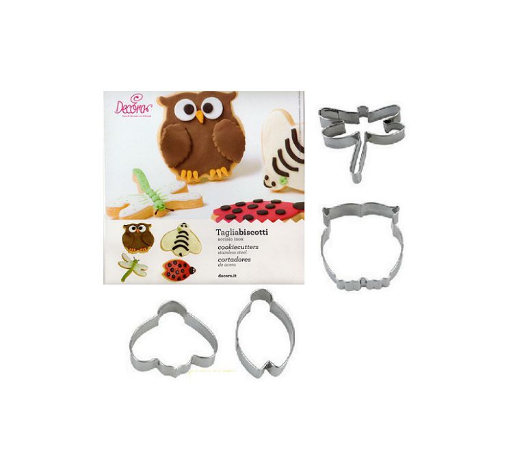 Maggiori dettagliSet realizzato da 4 tagliabiscotti in acciaio cm 7-8x h.2 che permettono di realizzare un gufo, una libellula, una coccinella e un'ape.
