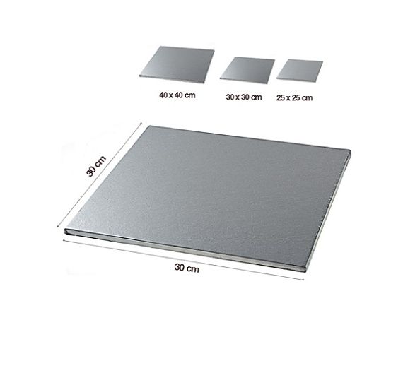 Sottotorta quadrato in cartone rigido rivestito con foglio argentato per alimenti. Resistente e riutilizzabile, è perfetto per presentare e trasportare le torte. Disponibile in misure da 25, 30, 40 e 45 cm