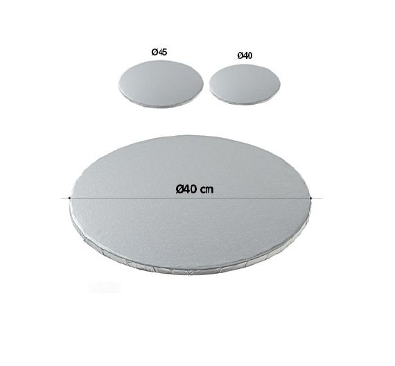 Sottotorta rotondo in cartone rigido rivestito con foglio argentato per alimenti. Resistente e riutilizzabile, è perfetto per presentare e trasportare le torte. Disponibile nelle misure 40, 45cm.