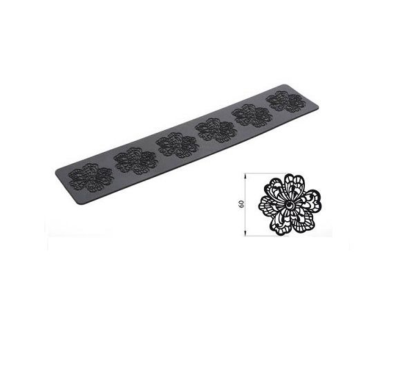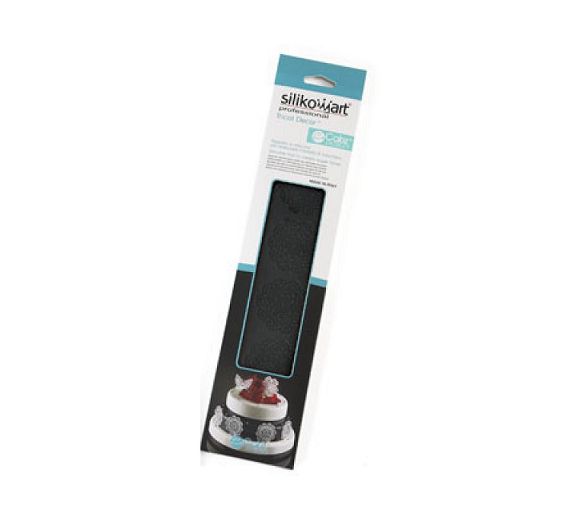 Tappeto in silicone nero della serie PROFESSIONAL per realizzare merletti di zucchero a forma di fiore. E' perfetto per decorare con originalità le torte a piani, cup cakes e biscotti. Estremamente flessibile, può anche essere tagliato per realizzare nastri e decorazioni. Il decoro risulta sottile e di sicuro effetto. Dimensioni: 80 x 400 h 1,8 mm