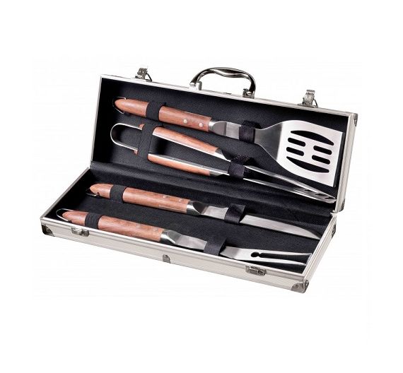 La valigetta barbecue di Brandani permette di avere sempre a portata di mano lo stretto necessario per cucinare sulla griglia. Questo Multi tools contiene una spatola, forchetta, pinza, coltello con manico legno e utensile in inox.