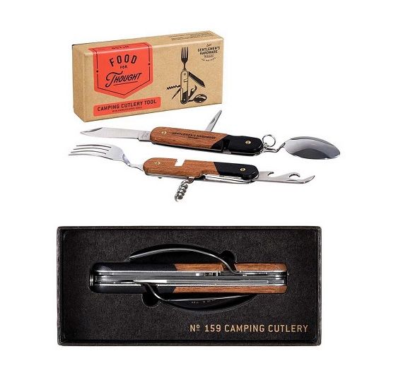 Pratico strumento multifunzione di Gentlemen’s Hardware può girare un hamburger, infilzare una salsiccia e stappare una bottiglia in un attimo. La spatola e la forchetta sono scorrevoli per un facile utilizzo. Questo versatile strumento da campeggio si divide ottenendo un set di posate in due pezzi che include anche un apriscatole, un cavatappi e un pennello.