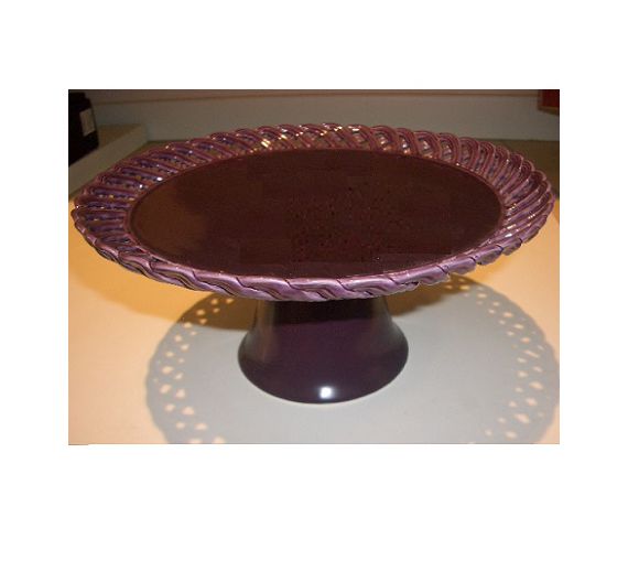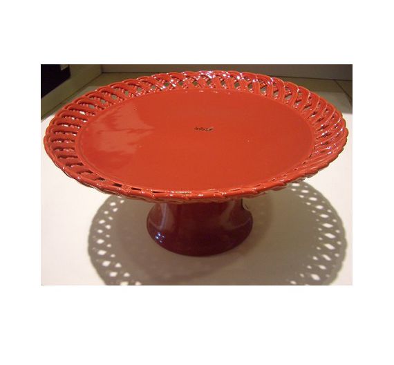 Elegante alzata Bitossi in ceramica stile traforato nei colori rosso e viola. Diametro 26 cm e h. 12,5 cm