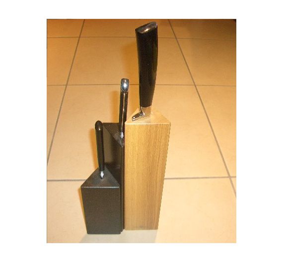 Pratico ceppo in legno wengè per contenere un coltello; può essere attaccato ad altri modelli dello stesso tipo, grazie ai due lati calamitati che ne permettono la salda presa sul fianco dell'altro elemento. Ha base triangolare (ciascun lato misura 7 cm) ed è alto 27,5 cm. Disponibile 1 wengè e 1 rovere.