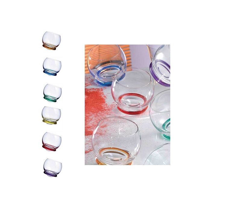Maggiori dettagliSet 6 bicchieri in cristallo Rogaska ideale per liquore (shottini), disegnati con appoggio inclinato e base con colori assortiti nella scatola.