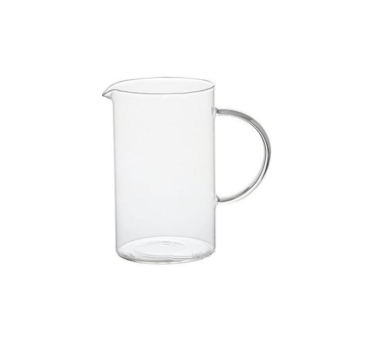 Caraffa in vetro borosilicato con manico blu e scritta decorativa: Pure Water. Capacità: 1,3 L.