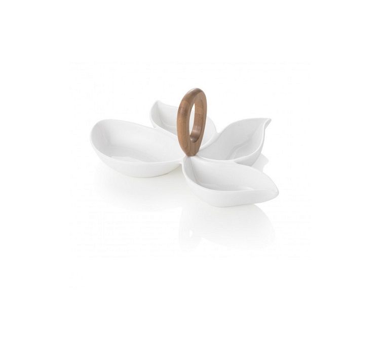 Qualità ed eleganza, sotto forma di antipastiera. L’antipastiera Rondò bianca, in porcellana e bamboo, è pronta a confermare un ruolo da “primattrice” tra le antipastiere proposte da BRANDANI. Ideale per stuzzichini, è suddivisa in 4 scomparti ed un elemento pronto ad accogliere le 2 forchettine in inox, con pomoli in ceramica.