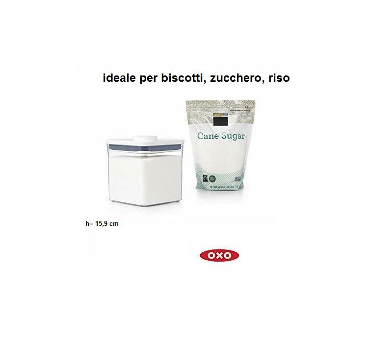 I contenitori della serie Pop Container di Oxo sono quadrati o rettangolari e sono facilmente impilabili in qualsiasi spazio della cucina utilizzando pochissimo spazio grazie alla diversa altezza e alla stessa misura della base: