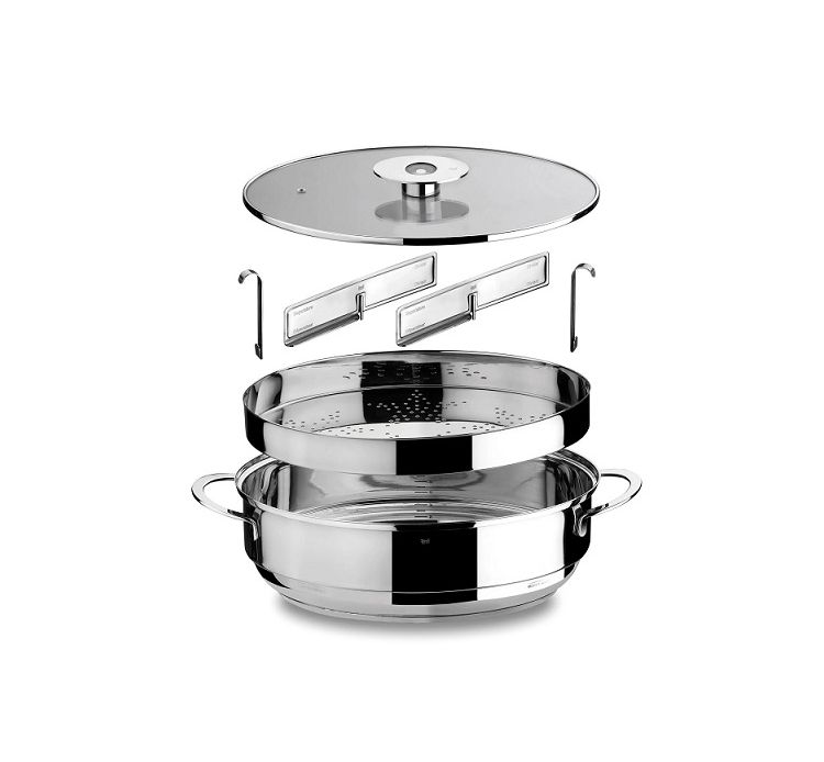 La prima pentola è una normale pentola per bollire l'acqua mentre la seconda è un piano con il fondo forato tutto in acciaio inossidabile 18/10 posizionata sulla prima pentola, dove vengono poggiati gli alimenti che verrano cotti grazie al vapore acqueo rilasciato dall'acqua e trattenuto dal coperchio trasparente. Ci sono inclusi due separatori in acciaio che permettono di cucinare due alimenti differenti contemporaneamente.