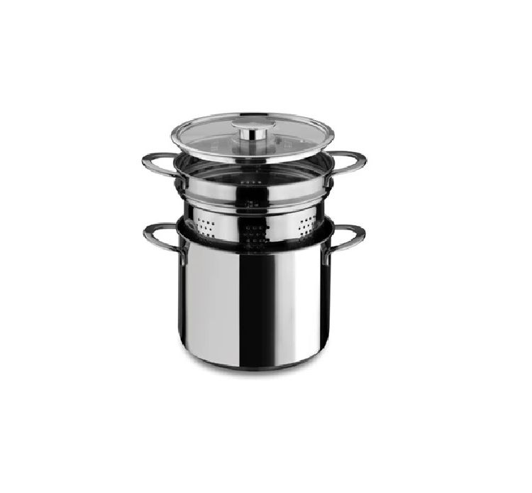 Maggiori dettagliPentola per la pasta Gourmet di Mepra in acciaio, rotondo 2 manici Ø22xh23 cm con coperchio inox/vetro e scolapasta in acciaio: pastaiola in acciaio anche per induzione, capacità 6 l ideale per cucinare la pasta e per una cucina naturale e sana, senza grassi, che permette l’esaltazione del vero sapore.