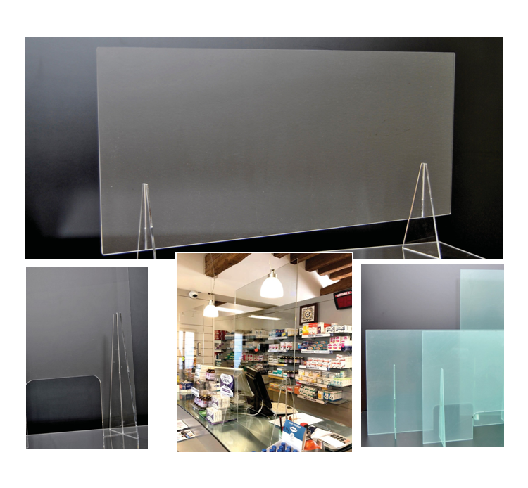 - Barriera protettiva e pannello divisorio in plexiglass posizionabile su superfici piane