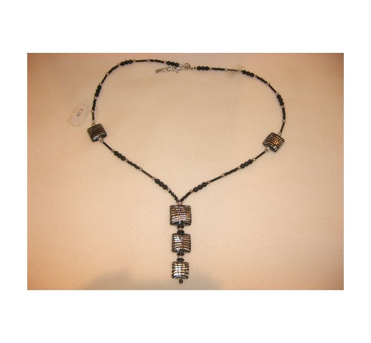 Collana Vittoria realizzata in perle quadrate (2 cm) di vetro nero con filigrana argento di Murano con un design leggero e giovanile: in uno stile del doppio giro tipico della gioielleria tradizionale si affiancano linee di design e tendenza. Lunghezza 78 cm.
