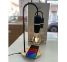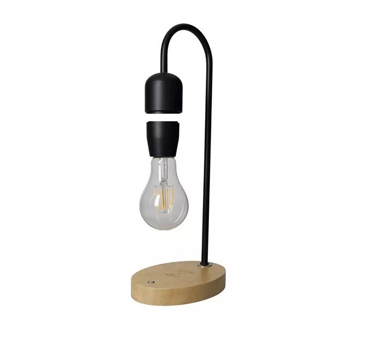 La lampada magicamente fluttua quando e' accesa distaccata dal supporto e la base in legno e' anche un caricabatteria per smartphone con funzione wirless attiva