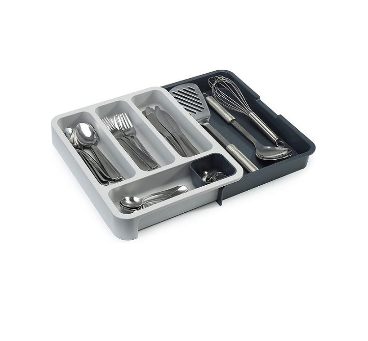 Le due metà del vassoio possono essere regolate con precisione per adattarsi a una varietà di dimensioni dei cassetti da 29 cm a 48 cm e si bloccano saldamente insieme una volta in posizione