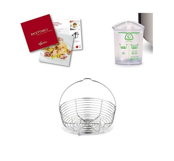 Sono inclusi nella fornitura il cestello per la cottura delle verdure, un contenitore “ecodose” per utilizzare l’esatta quantità di liquidi come indicato in ogni ricetta ed infine un pratico ricettario con gustosissime proposte per preparare i vostri piatti.
