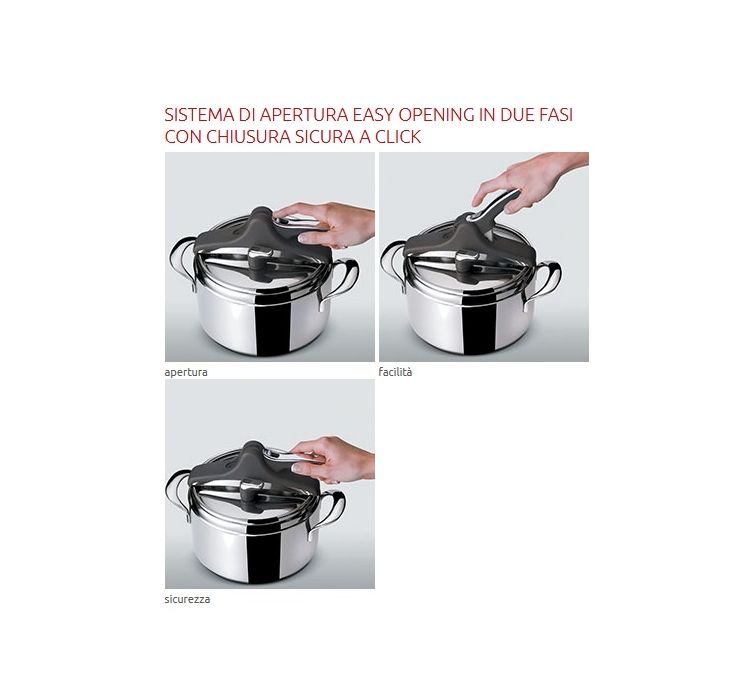 Tags: pentola, pressione, lagostina, vitamin, domina, pot, pressure,Easy Opening System: Basta premere in basso il manico e poi tirare il pulsante per sbloccare il sistema di apertura senza alcuno sforzo aggiuntivo. La chiusura, facile e possibile in tutte le posizioni, viene confermata da un “click” sonoro.
