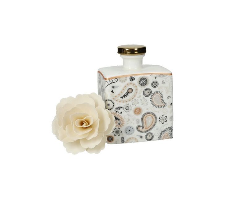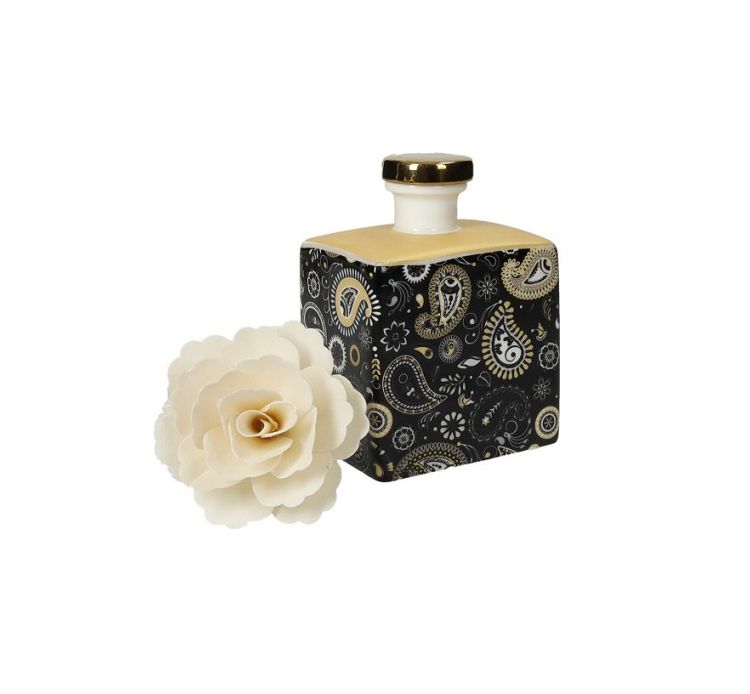 Dotato di elegante fiore diffusore in legno e tappo oro ermetico