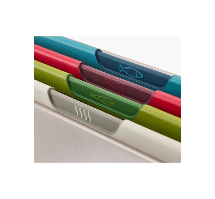 Il set di taglieri più venduto include quattro taglieri di diverso colore, ciascuno con un'icona illustrata per aiutare a prevenire la contaminazione di sapori (carne cruda, pesce crudo, verdure o cibi cotti ) e si ripongono tutti all'interno di una custodia.