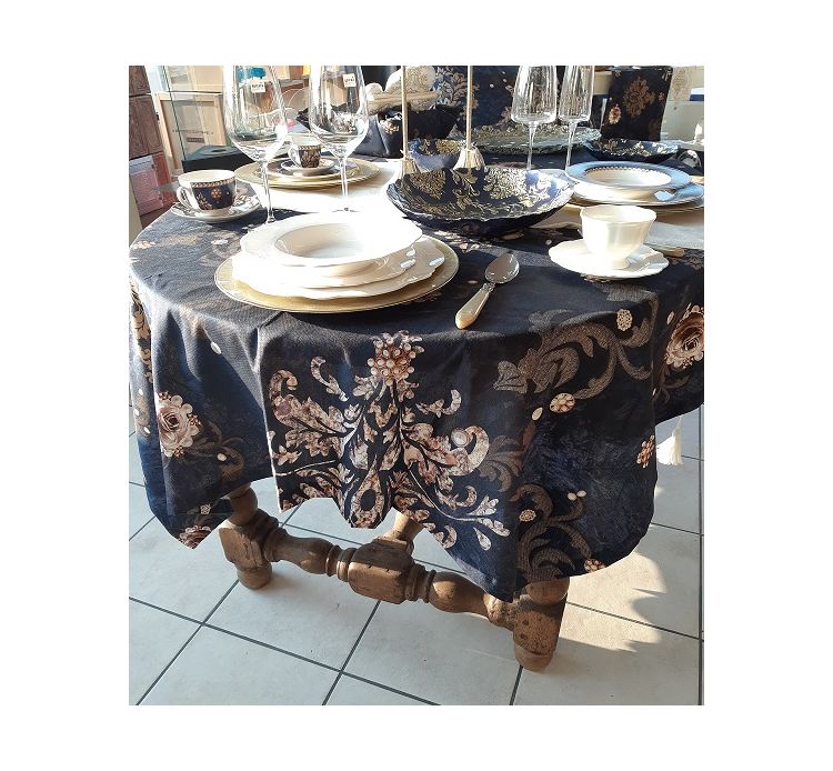 Ingrandisci Collezione realizzata in 100% cotone costruzione tela panama con stampe oro e inseriti in lurex, che coniuga al tempo stesso la grinta e la freschezza di interni giovani e contemporanei con la cura e la ricchezza di finiture uniche: il damasco stampato, il blu notte intenso, l’oro e le perle brillanti saranno i protagonisti di runner, tovaglie, strofinacci, presine e grembiuli ma anche di fantastici cestini portapane, sottopiatti e cuscini che trasformeranno il tuo living in un ambiente di grande pregio e in grado di trasmettere al primo sguardo carattere e forte personalità.